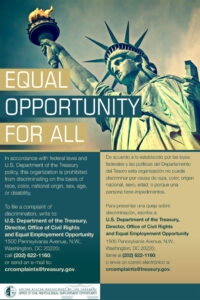 To file a complaint of discrimination, write to: U.S. Department of the Treasury, Director, Office of Civil Rights and Equal Employment Opportunity 1500 Pennsylvania Avenue, N.W., Washington, DC 20220; call (202) 622-1160; or send an e-mail to: crcomplaints@treasury.gov.